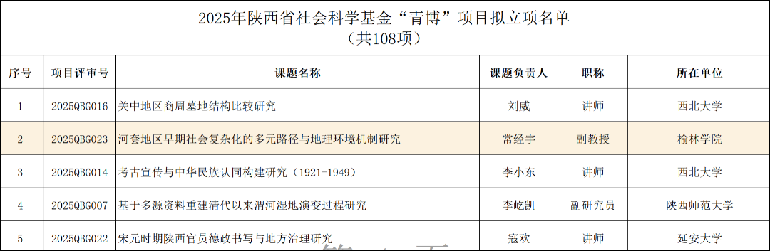近日,陕西省哲学社会科学工作办公室公布了2025年度陕西省社会科学基金年度项目“青博”项目立项名单,我院历史学专业常经宇博士申报的课题《河套地区早期社会复杂化的多元路径与地理环境机制研究》获批“青博”项目。