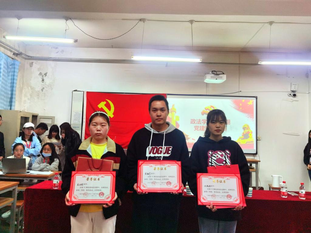 为深入贯彻习近平新时代中国特色社会主义思想,学习党史知识,端正入党动机,充分发挥学生党支部的战斗力和凝聚力,切实加强对入党积极分子的培养教育,4月25日政法学院学生党支部在3401举办了第53期党建知识竞赛,24名入党积极分子参加了比赛,学生党支部书记李瑞瑞老师出席本次活动。