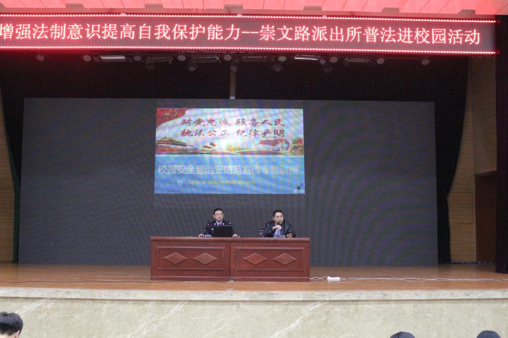 2021年4月9日下午7时许,崇文路派出所于图书馆二楼学术报告厅开展“安全暨治安防范宣传专题讲座”,本次讲座由崇文路派出所杜俟雷担任主讲,政法学院党总支副书记张国涛主持,政法学院19、20级全体同学参与讲座。