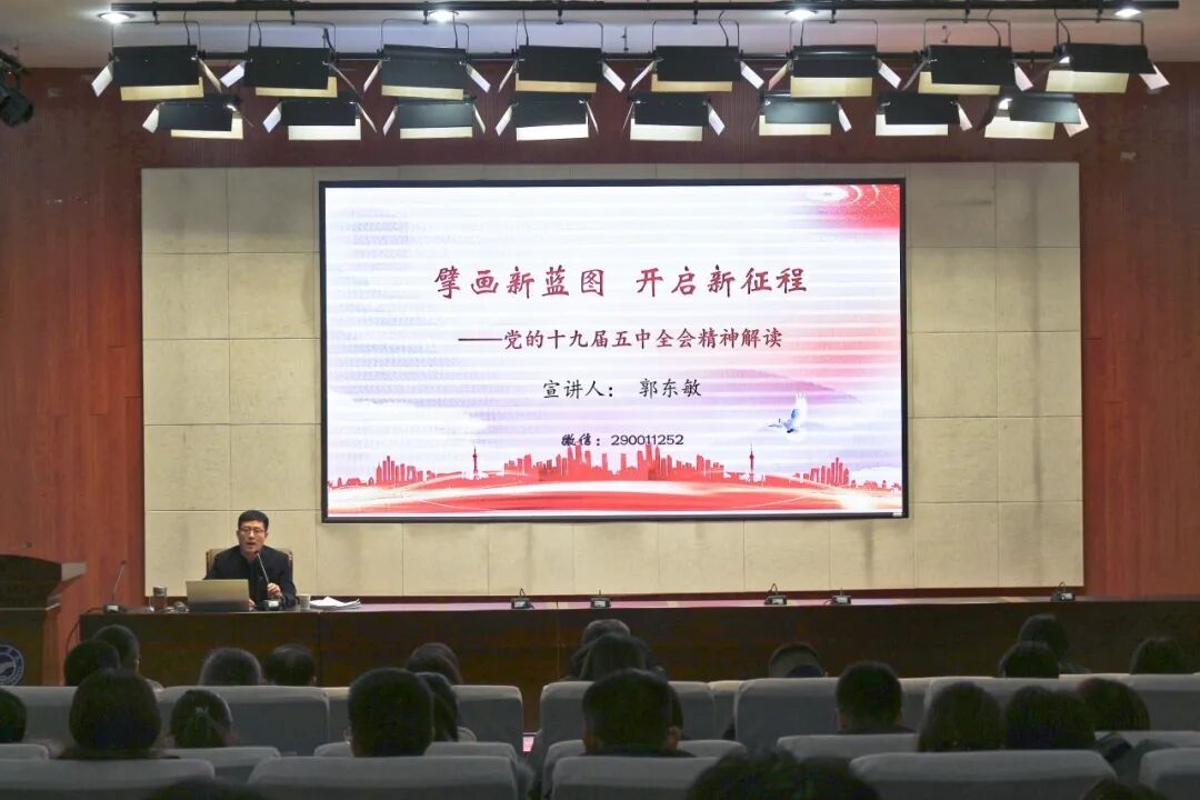为深入学习党的十九届五中全会精神,进一步増强师生党员的政治理论素养。12月10日,政法学院党总支在逸夫楼一楼报告厅举行十九届五中全会精神解读宣讲活动。本次宣讲由马克思主义学院博士、副教授郭东敏主讲,政法学院全体党员参加,党总支书记魏子斌主持。