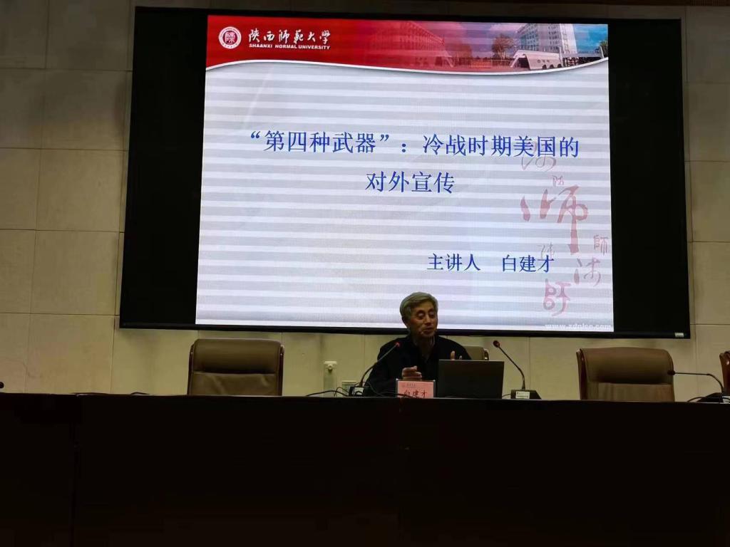 为庆祝我校百年华诞,2023年4月6日下午,政法学院邀请陕西师范大学历史文化学院二级教授、博士生导师白建才教授在逸夫楼学术报告厅为师生作了题为“第四种武器”:冷战时期美国的对外宣传学术讲座。政法学院100余名师生聆听了学术讲座,政法学院副院长赵勇宾主持学术讲座。