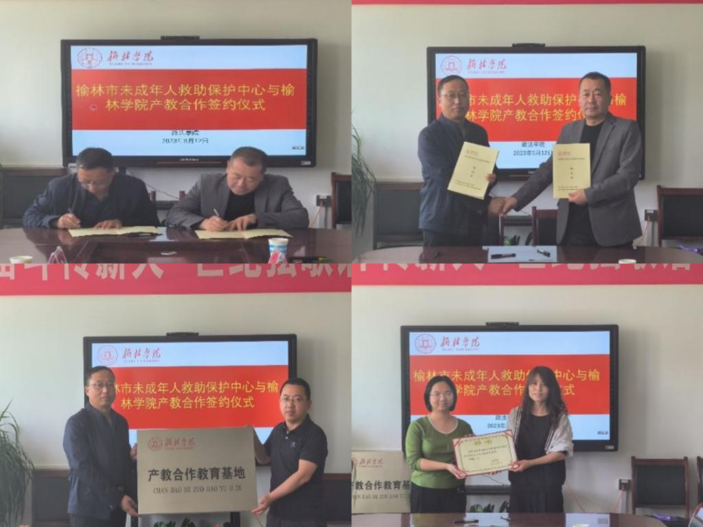 白炜与榆林市未保中心主任雷祥鹏签订产教合作协议;赵勇宾为未保中心授产教合作教育基地牌;李娜为石璞洁颁发实习指导老师聘书。邱韵重点汇报了2022年“向日葵成长计划”项目的完成情况。