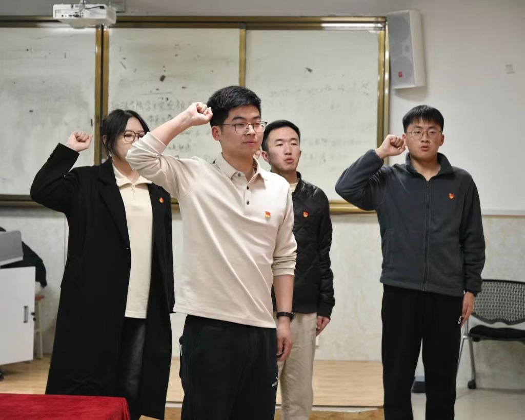 接着,由学生第一党支部副书记吕猛带领3名同志面向党旗进行了庄严宣誓。铿锵有力的誓言,不仅代表着他们顽强拼搏的奋斗决心,更诠释了他们不忘初心、牢记使命的强烈信念。