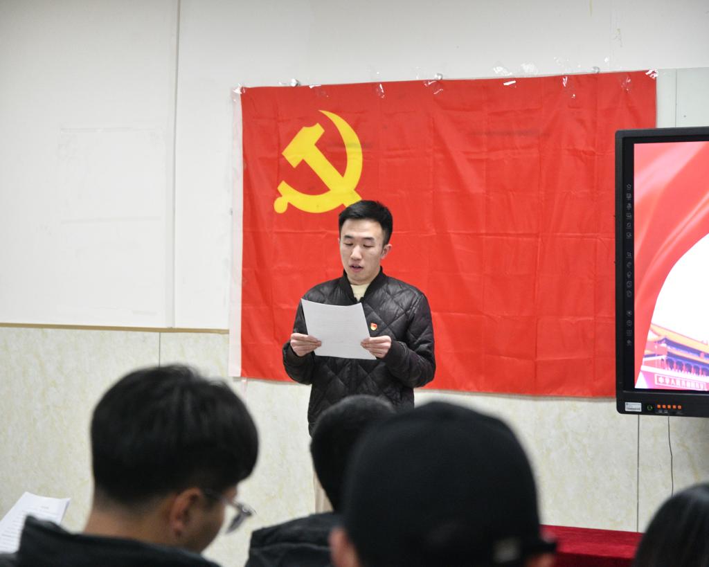 会后,学生第一党支部副书记吕猛领学习近平新时代中国特色社会主义思想专题摘选,领学新思想,激发凝聚力。他指出“行不率则众不从,身不先则众不信。”要坚持理论指导和实践探索相统一,充分发挥党员的先锋模范作用,续写新征程的新篇章。