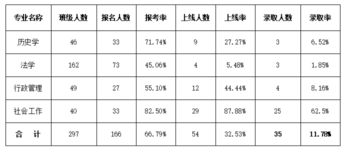 政法学院2022届本科毕业生共297人,其中166人参加了2022年硕士研究生入学考试,报考率达66.79%;上线54人,上线率达32.53%;录取35人,研究生录取人数占毕业生总人数的11.78%。其中,社会工作专业录取率最高,录取人数占班级总人数的62.5%。