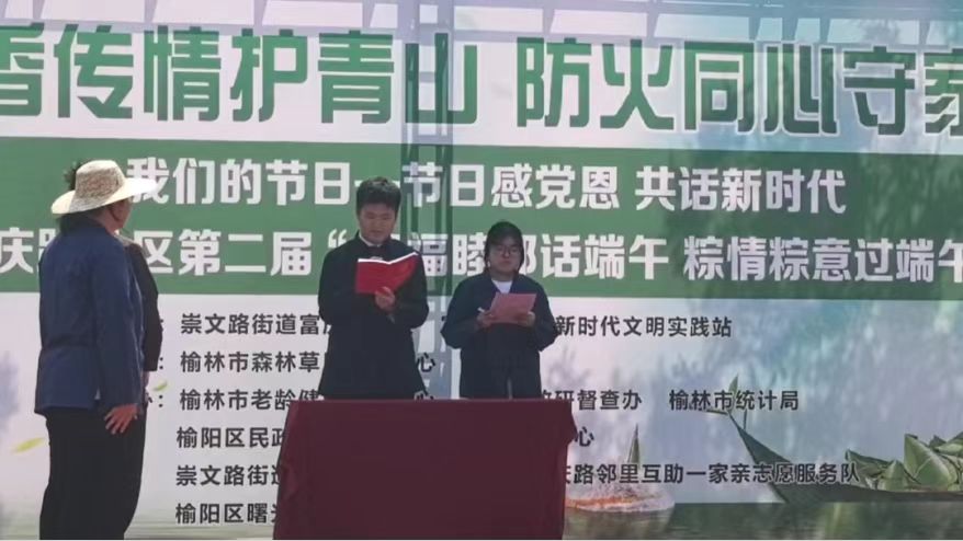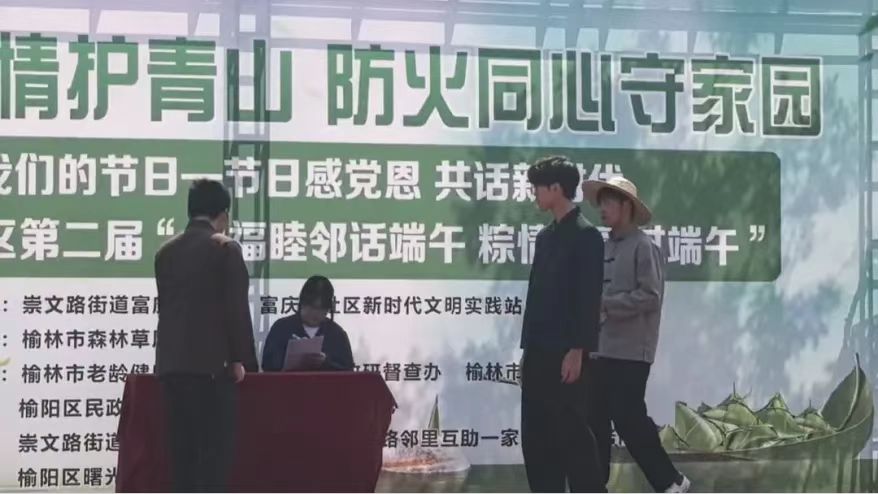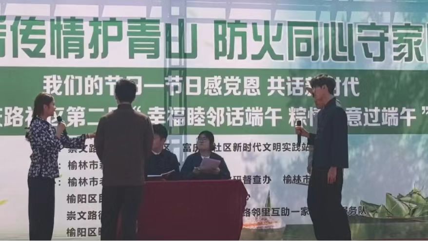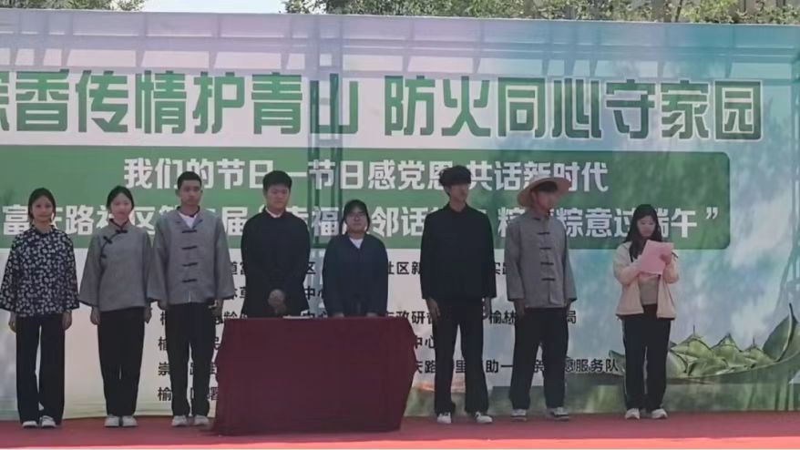 为赓续红色法治血脉,赋能基层治理现代化,“和民善治”法律志愿服务队联合崇文路司法所,深入践行马锡五审判方式的司法为民理念。2025年5月28日,在指导老师折静的带领下,“和民善治”团队前往榆阳区富庆路社区参加第二届“幸福睦邻话端午 粽情粽意过端午”的社区活动,并进行剧本《公正之心》的演出。
