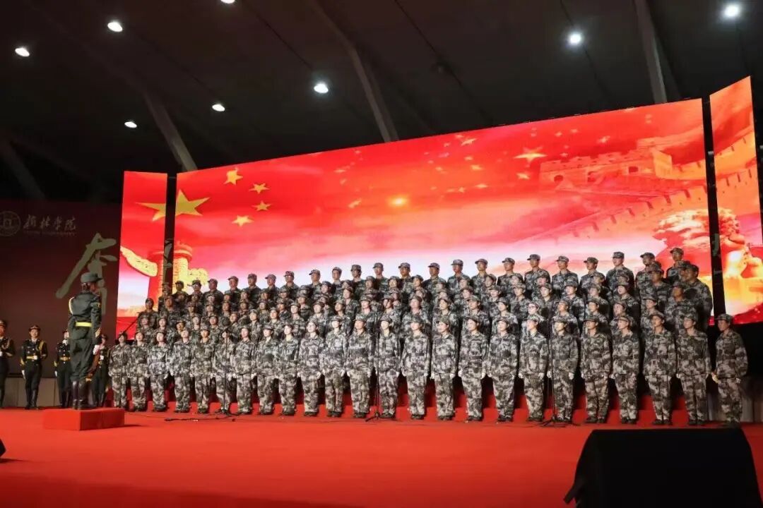 彼时新生军训正酣,学院参赛学生面临“训练+排练”的双重考验。他们主动调整节奏:白天以饱满的状态完成队列队形、军体拳等军事科目,夜幕降临后便迅速投入到合唱排练中。从咬字发音的精准拿捏、旋律节拍的默契配合,到红色情感的深度诠释;从舞台站位的整齐规划、肢体动作的自然协调,到精神面貌的昂扬展现,同学们不放过任何细节,以“精益求精”的态度反复打磨,只为在舞台上呈现最佳状态。