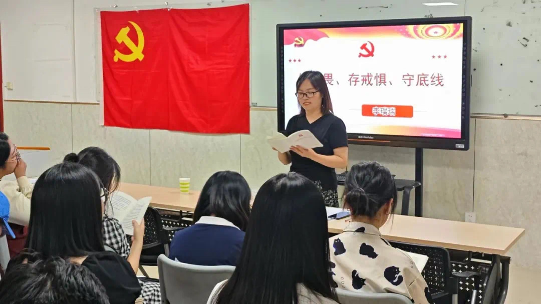 会议第二项,学生党支部书记李瑞瑞从知敬畏、存戒惧、守底线三方面展开了讲述: