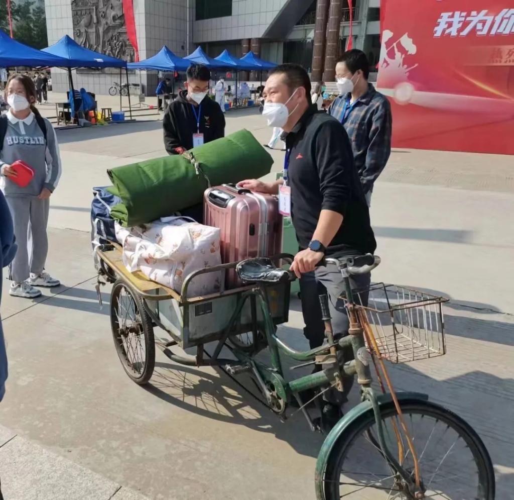 他们说:“没事儿,李书记,我们先拿上去,不累”、“老师,不重,我们都是年轻小伙子,这不算啥。”、“是啊,这一次换我们这些大四的老学长守护大家!”