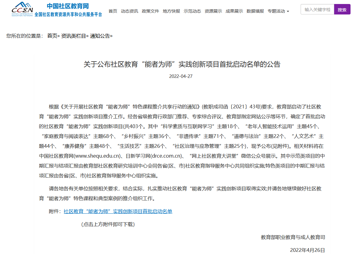 根据《关于开展社区教育“能者为师”特色课程推介共享行动的通知》(教职成司函〔2021〕43号)要求,教育部启动了社区教育“能者为师”实践创新项目推介工作。经各省级教育行政部门推荐、专家综合评议、教育部指定网站公示等环节,确定了首批启动的社区教育“能者为师”实践创新项目。伟德国际唯一“高校助力社区建设红色教育实践课程”项目入选特色类实践创新项目,该项目是陕西省入选的唯一一个“人文艺术”主题项目。