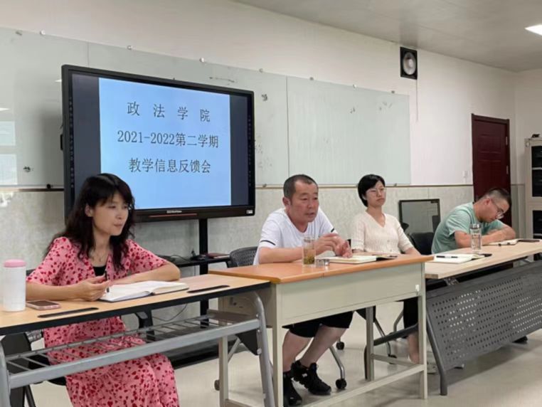 政法学院于2022年6月24日下午在3407教室召开了本学期教学信息反馈会。政法学院院长白炜、党总支书记李慧梅、副院长李娜、教学秘书赵亚珠及各班级班长、学习委员参加了本次会议。会议由副院长李娜主持。