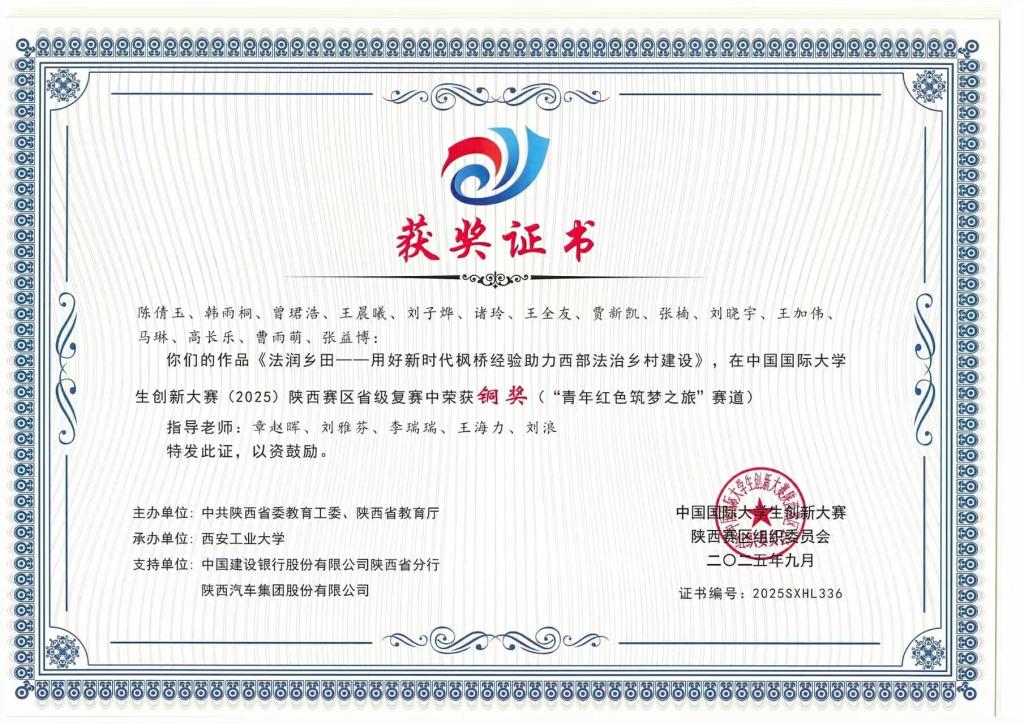 近日,2025年中国国际大学生创新大赛(2025)陕西赛区省级复赛获奖名单正式公布。伟德国际VICTOR1946“春风法雨润乡田”团队凭借作品《法润乡田——用好新时代枫桥经验助力西部法治乡村建设》,在竞争激烈的“青年红色筑梦之旅”赛道中脱颖而出,荣获省级铜奖。