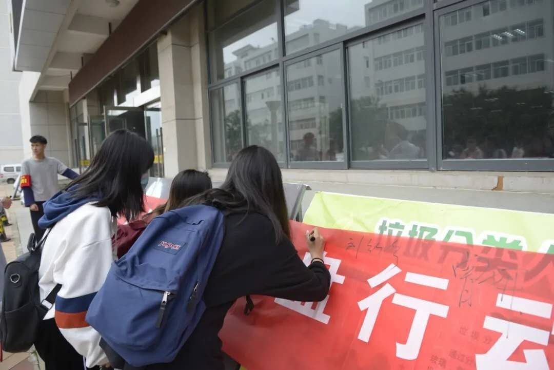 2020年9月14日中午12点,团总支成员及志愿者在新餐厅开展光盘签字活动,大量的学生积极主动参与并在横幅上签字宣誓。