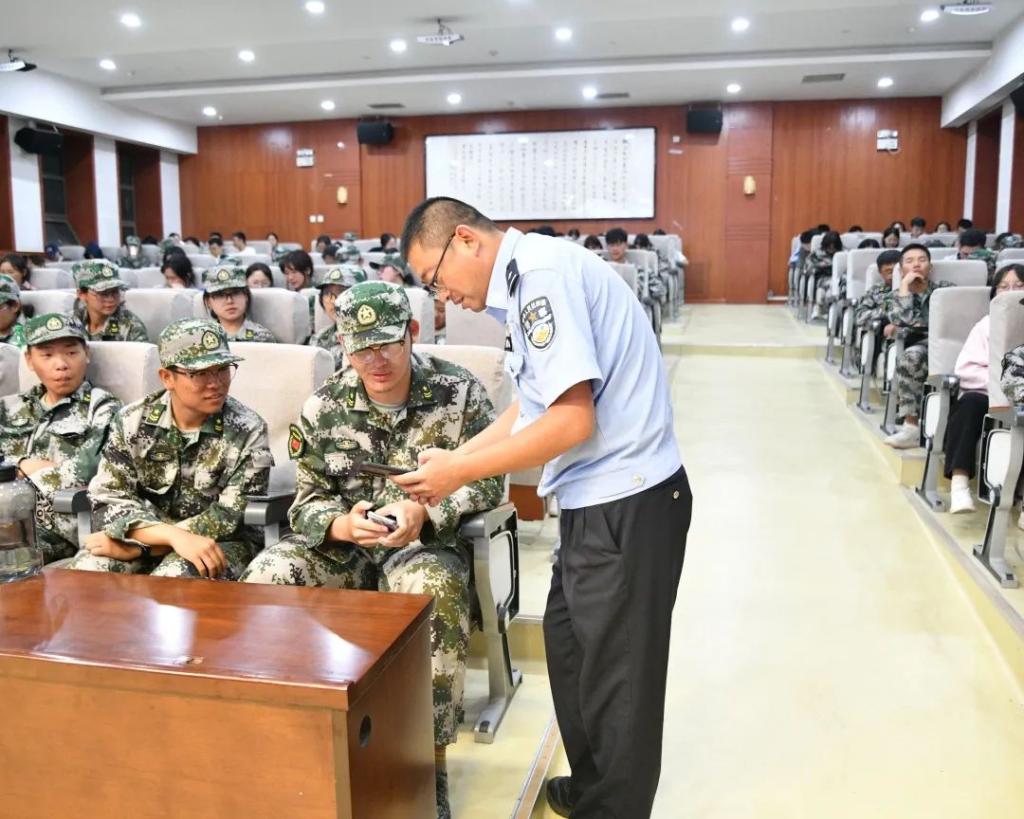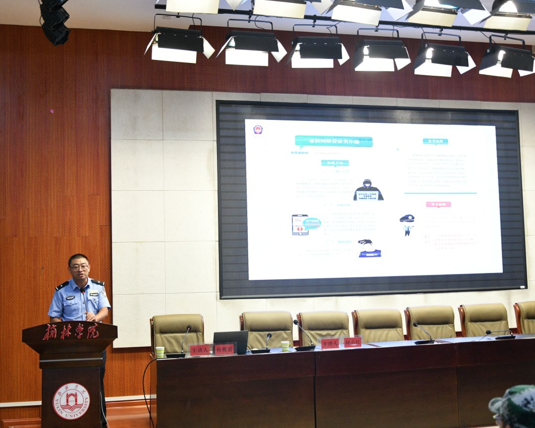 为持续深化警校共建机制,加强校园安全综合治理,引导大学生树立牢固的安全防范意识,提高应对突发事件的能力,创建平安和谐校园。我院联合学校保卫处和崇文路派出所于9月19日晚七点半在逸夫楼一楼报告厅召开新生安全教育主题讲座。本次讲座由政法学院党总支副书记何小红主持,崇文路派出所杜俟雷担任主讲人,2023级全体新生参加。