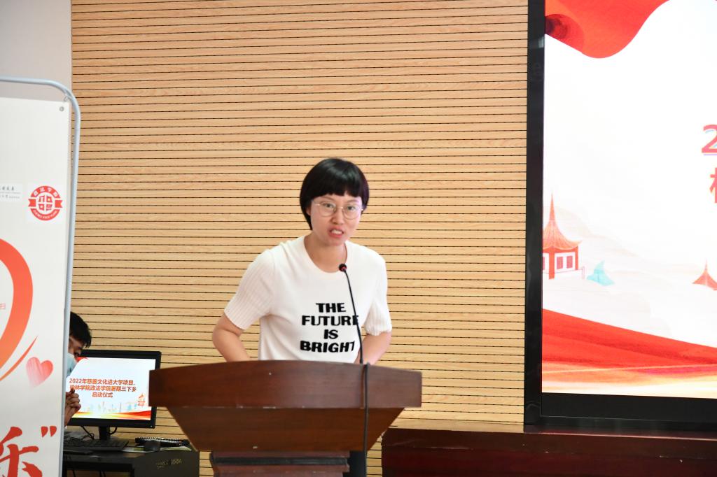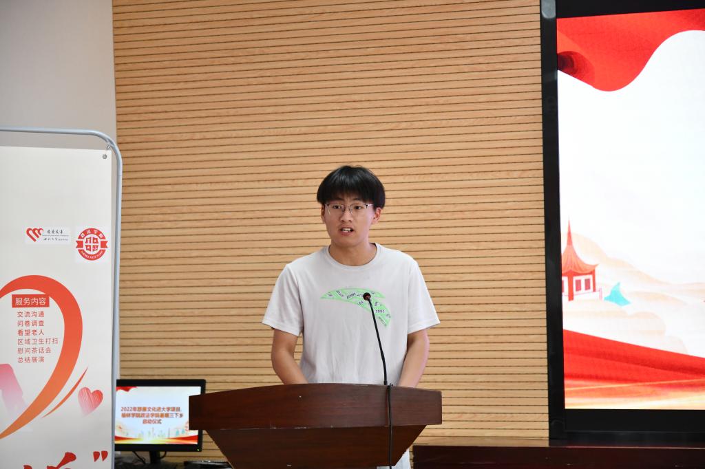 习近平总书记深刻指出:希望广大青年用脚步丈量祖国大地,用眼睛发现中国精神,用耳朵倾听人民呼声,用内心感应时代脉搏,把对祖国血浓于水、与人民同呼吸共命运的感情贯穿学业全过程、融汇在事业追求中。希望大家在接下来的三下乡活动中用心、用情、用力完成好每一项任务,在未来的实践基地中得到更多的感悟与学习。
