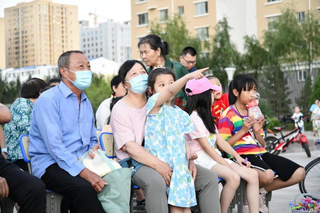 7月23号晚上八点,“安护羽翼”暑期志愿服务团与“与老共乐”暑期志愿服务团于金阳小区播放了《举起手来》和《没有共产党就没有新中国》两部电影。