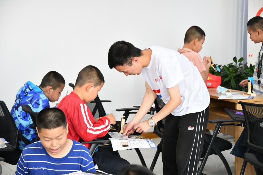最后就是DIY电动小风扇,小朋友们坐成一排,在志愿者们的指导下,自己做出小风扇。既锻炼了他们的思考能力,又锻炼了动手能力。